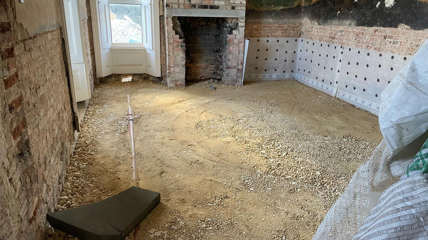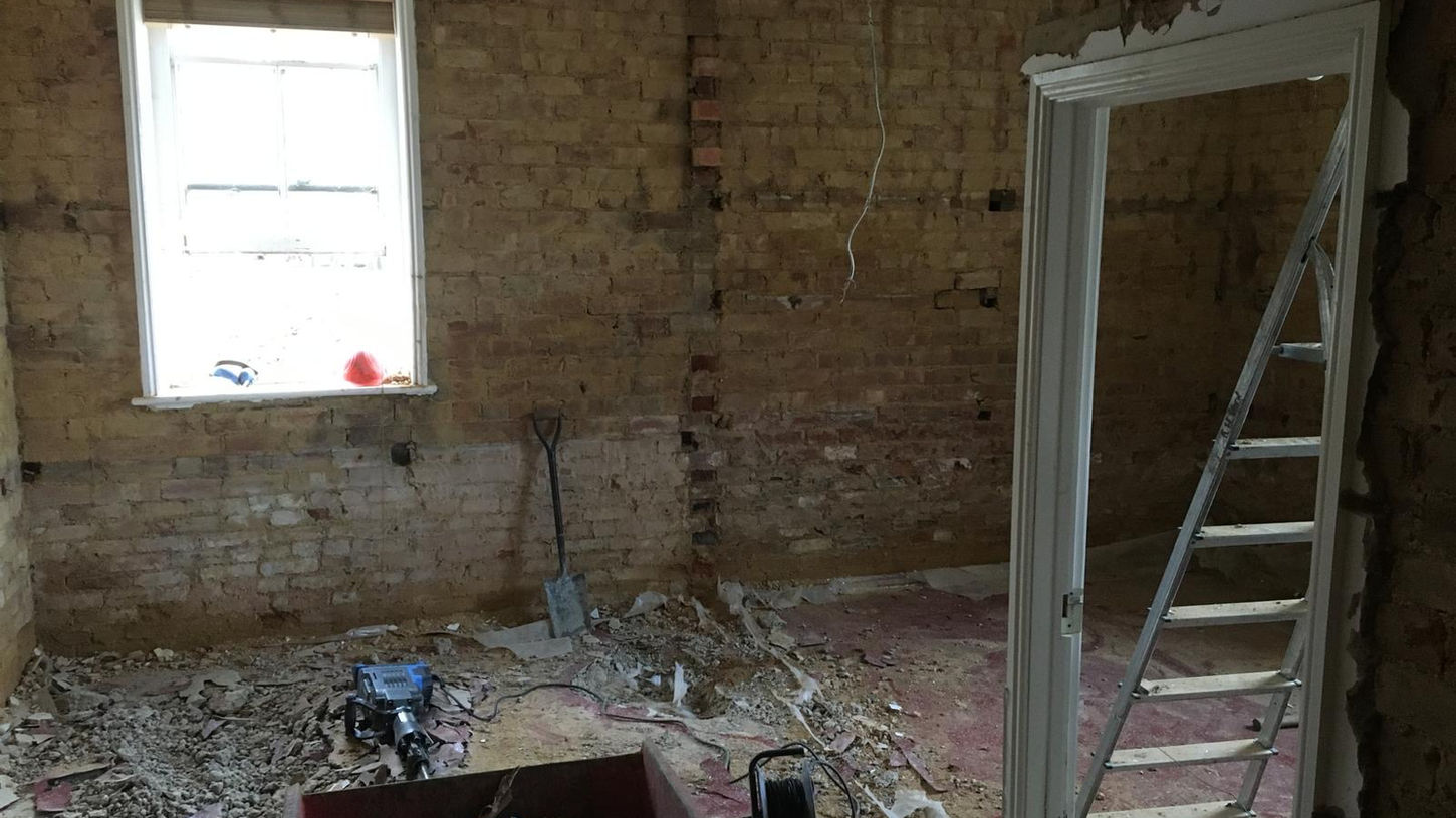 We started with the idea that we would make the current plaster on the walls ‘good’ and work with what we had, a much more modest plan than what we eventually undertook. The house was stripped back to bare walls and insulated, all the floors were dug up all underfloor heating laid throughout. The house is now heated with a ground source heat pump, which consists of ... meters of underground pipe work, an impressive installation to watch.