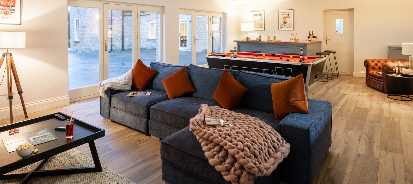A large games room has also been created for guests from an old stone outbuilding, offering a bar complete with drinks fridge and bar stools, an American pool table, sizeable corner sofa and a large wall mounted Smart television and a Bluetooth speaker.